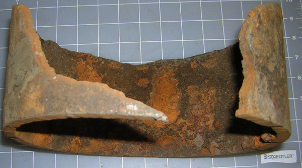 The chemistry of the fragments are typical of cast iron piping material, so material defects are not the likely cause of the failures. Cast irons are brittle by nature and are more fracture sensitive than wrought materials. Based on the significant corrosion and material loss on the exterior of the pipe, the fracture most likely initiated at an area of reduced cross-section, and may have been caused by internal (water pressure) forces, or by some external force including, but not limited to, nearby construction activity, expansion and contraction of the soil, erosion and/or settlement of the soil surrounding the pipe.