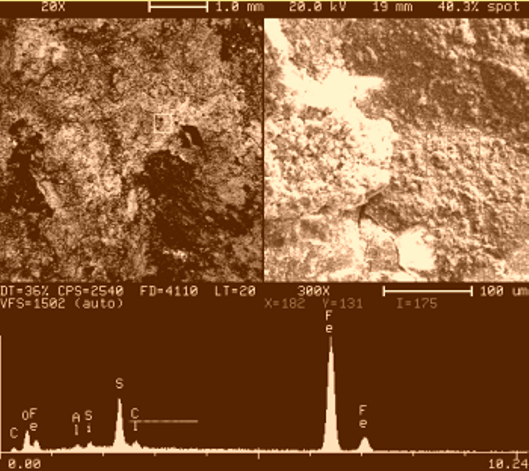 The analysis of the corrosion deposits on the outside of the pipe by Energy Dispersive X-ray (EDX) showed a high concentration of sulfur in addition to smaller amounts of chlorine. Photo 6 is a typical EDX spectrum representing all the elements found.