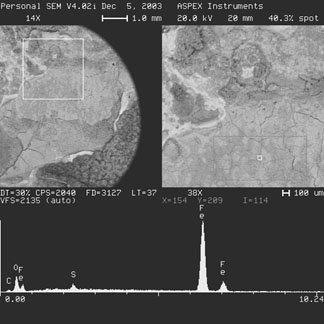 A clean area (area with no deposit) was analyzed for reference purposes and was found to contain only iron (Fe). Typical deposits and the surfaces of the pits under the deposits both contained sulfur (S), as evident in EDX below.